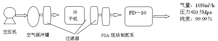 本套装置由压缩空气系统、压缩空气净化系统、变压吸附制氮系统、氮气纯化系统组成。